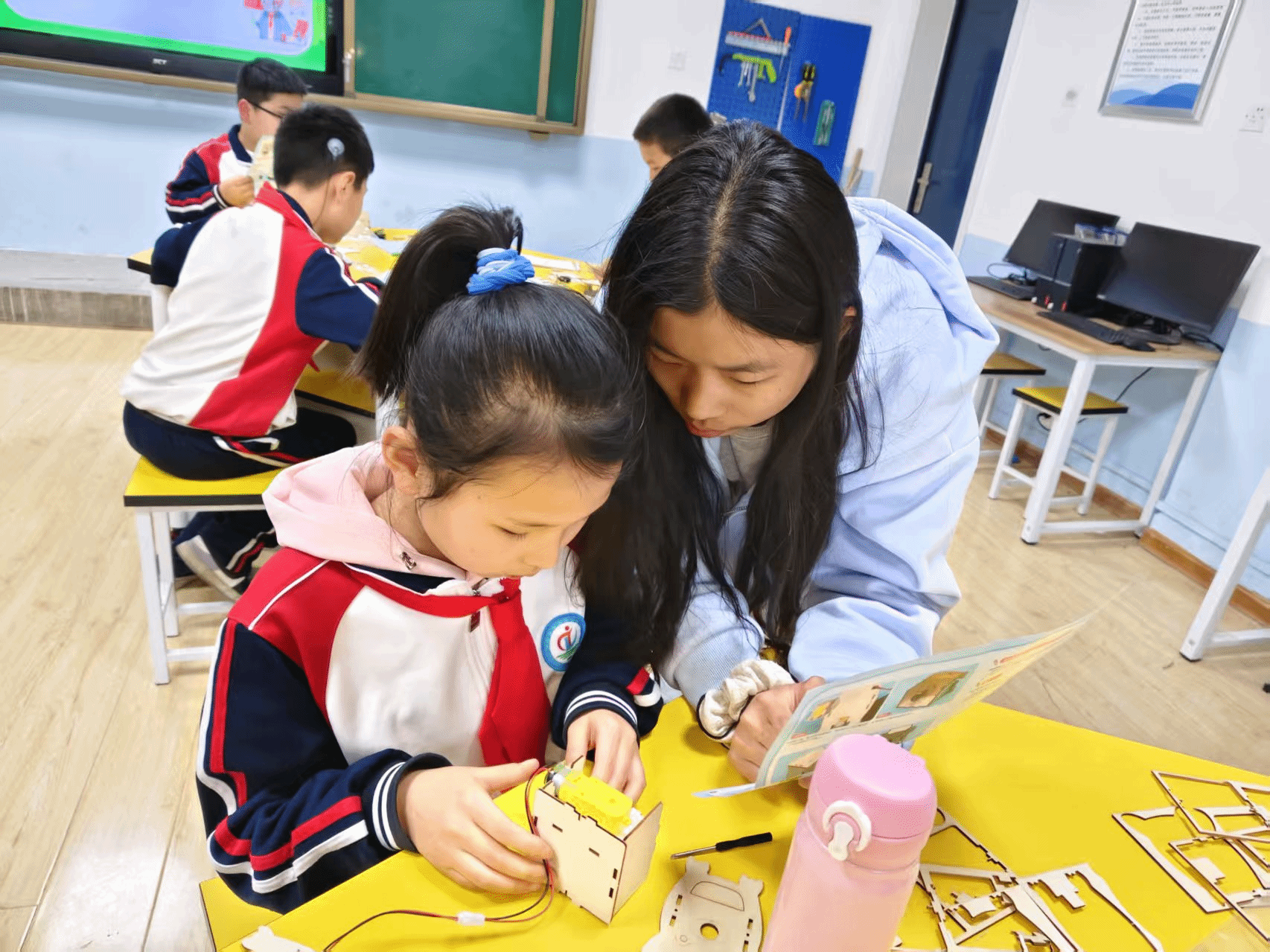 此次活动分为知识讲解、小组制作、成果展示、评选颁奖、领导总结和作品展览六个板块。小学生们通过生动的PPT,学习了电动转笔刀的工作原理和制作步骤。在小组制作环节,实习生耐心指导学生组装零件、连接电路,并鼓励他们大胆尝试、勇于创新。