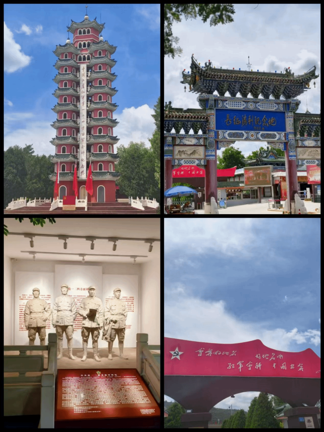 红旗拱门如同一帧历史剪影,有尊严的地名……红军会师,中国安宁的题字与三面军旗相互呼应。红旗的弧度恰似长征路上的波折,五角星与文字交织,定格了胜利的喜悦与坚守的不易。最令人震撼的是会师纪念塔,红墙绿瓦直入云霄,塔身上的题字在阳光下格外醒目。层层窗棂如时光之眼,见证着当年的热血与如今的传承;塔前红旗猎猎,是先辈初心在新时代的延续。