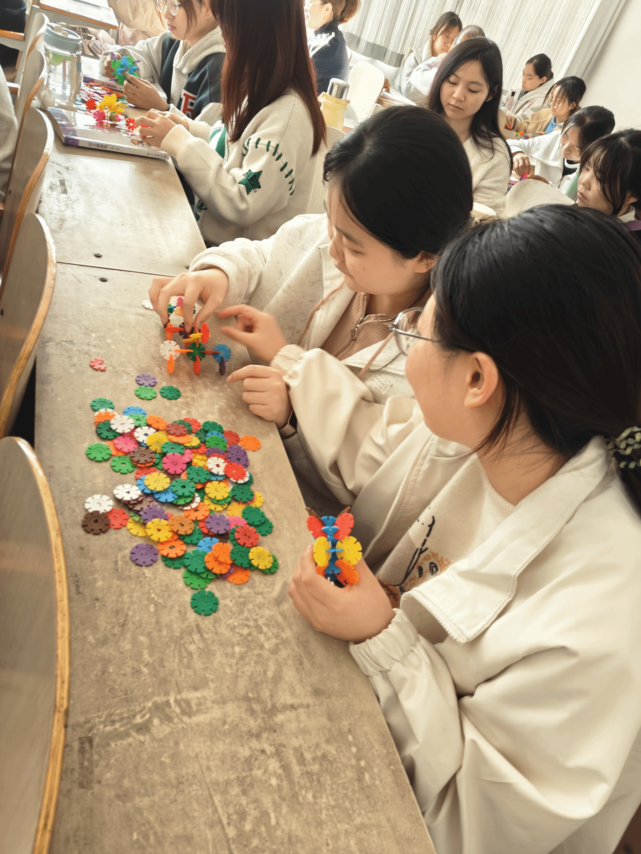 课桌化身为同学们的“建构工作台”。他们沟通、协商、分工,将脑海中抽象的构思,转化为具象的立体结构。同学们在“做”中真切体会到,教育的空间核心不在于场地的大小,而在于是否被赋予了探索的可能。看似简单的建构游戏,如何因地制宜地促进幼儿认知、社会性与非智力因素的全面发展,成为了大家最深刻的感悟。