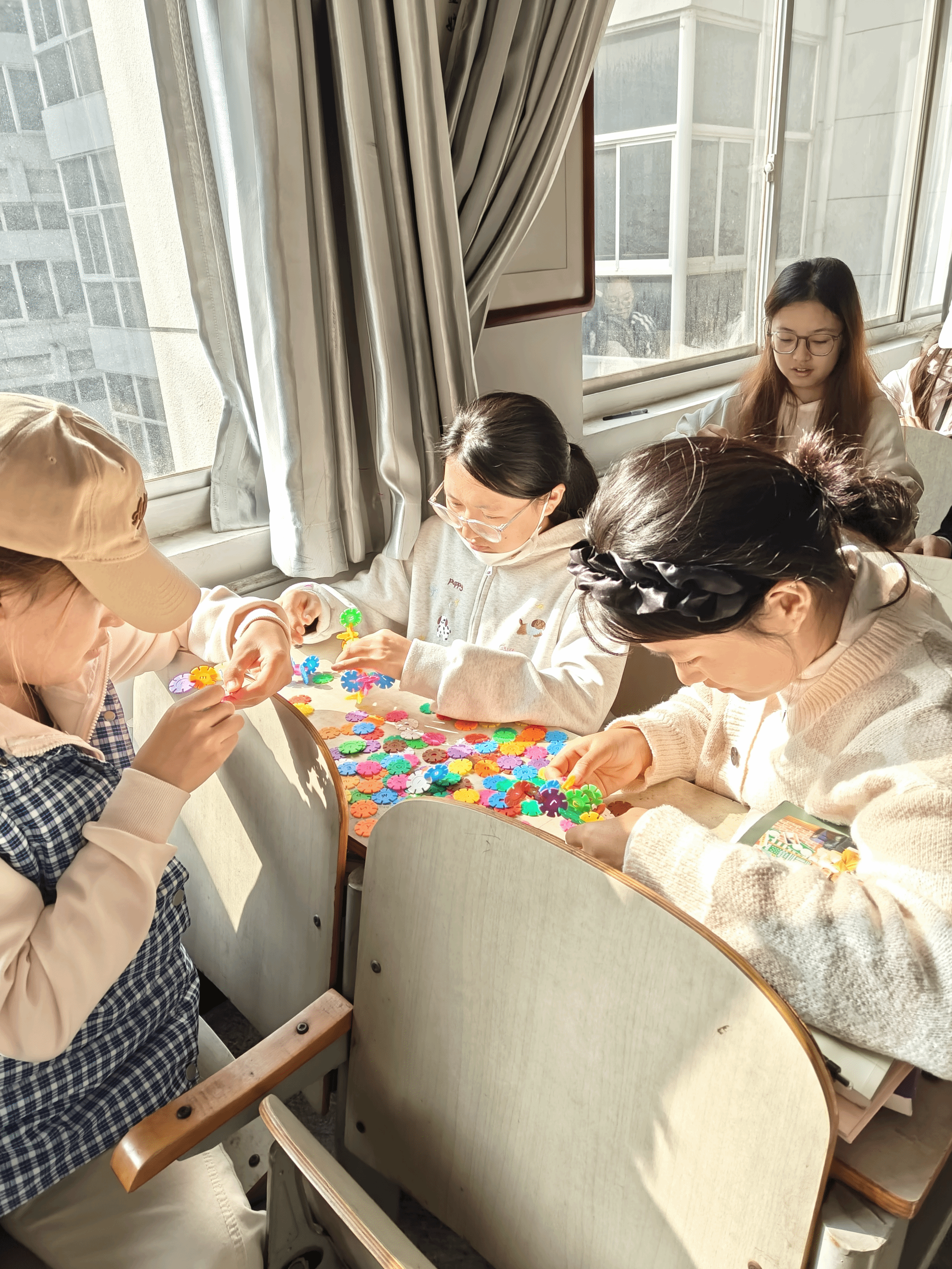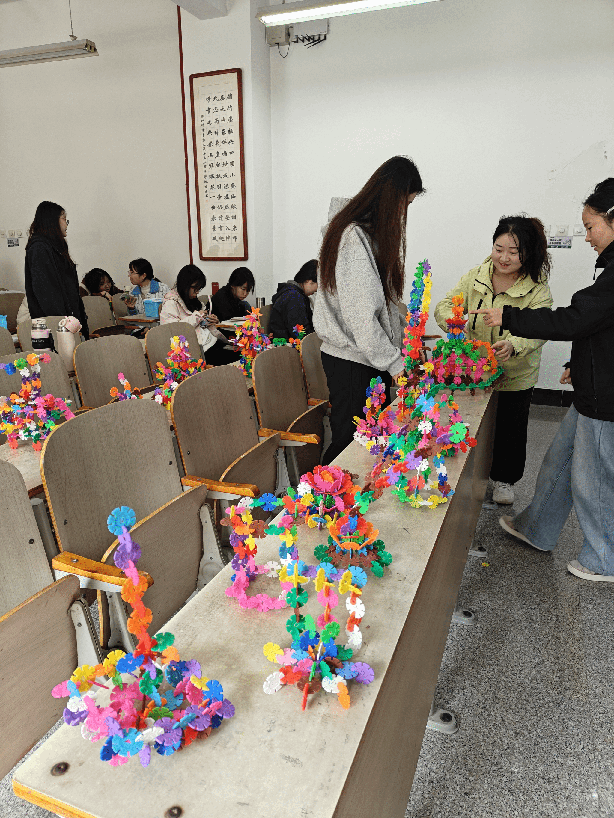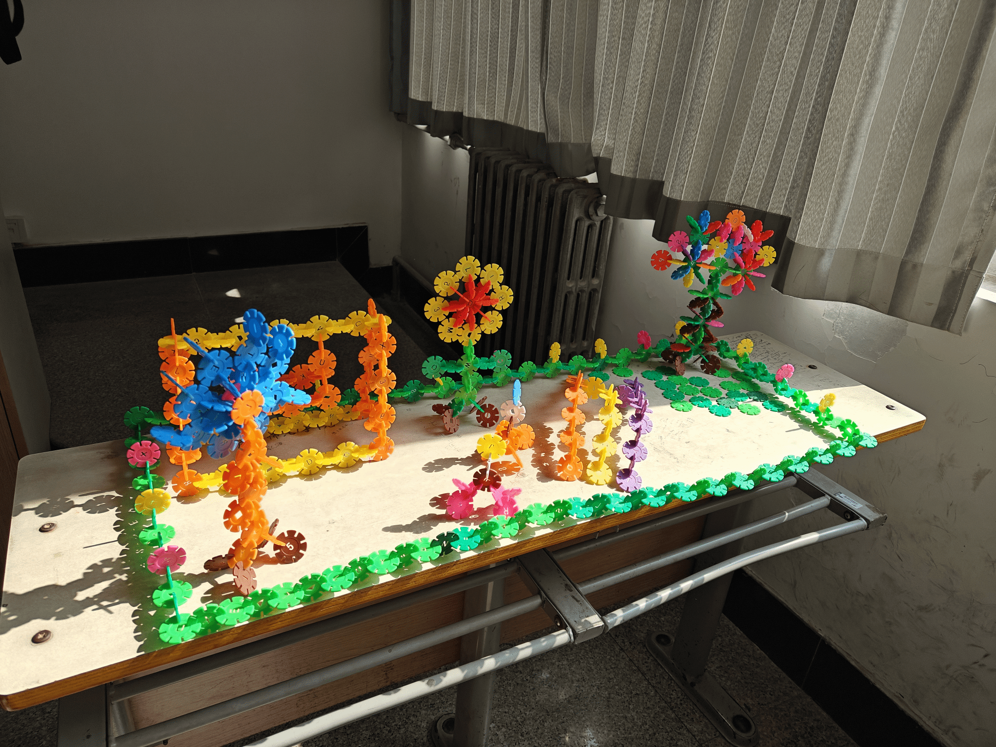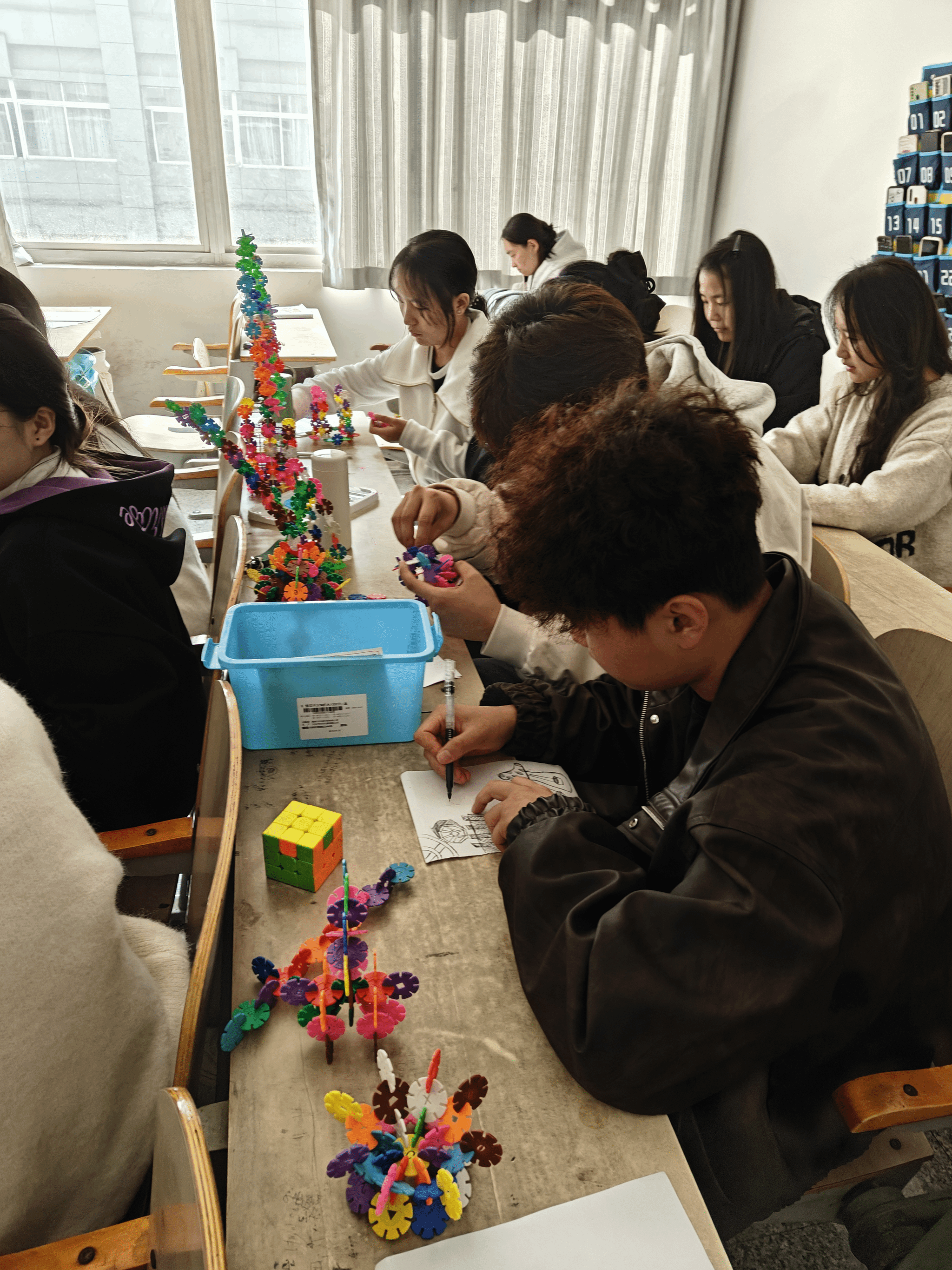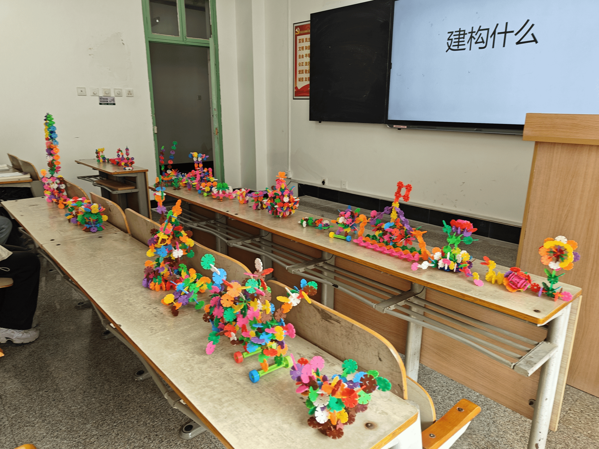 在结构游戏的专题课堂上,普通的雪花片成为了点燃创造力的火种。同学们被分为四个建构小组,在自主选择的主题引导下一方课桌之上启了合作建构之旅。