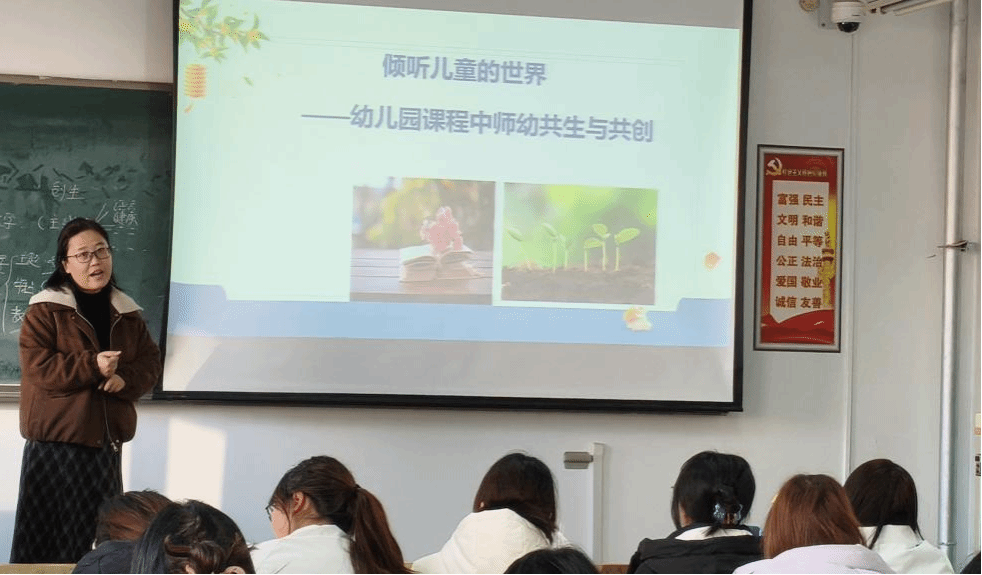 为深化学前教育专业学生对当代儿童观与课程观的理解,2025年12月3日上午,官瑞娜老师主讲了“倾听孩子的世界幼儿园课程中的共生与共创” 的专题讲座。本次讲座旨在引领学生超越传统教学模式,探索基于深度倾听、师幼共生与动态共创的学前教育新路径。